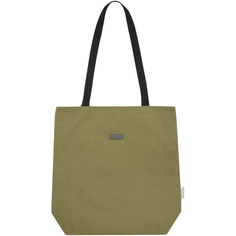 Torba na zakupy wykonana z płótna z recyklingu z certyfikatem GRS, z podszewką z RPET z certyfikatem GRS. Ta uniwersalna torba na zakupy posiada wyściełaną przegrodę na 15-calowego laptopa i dwie kieszenie wewnętrzne na telefon, portfel lub akcesoria, a także łatwe zapięcie na guzik i wygodne bawełniane uchwyty. Ozdobna metalowa płytka może sprawić, że logo będzie świecić dzięki subtelnemu i matowemu wykończeniu.