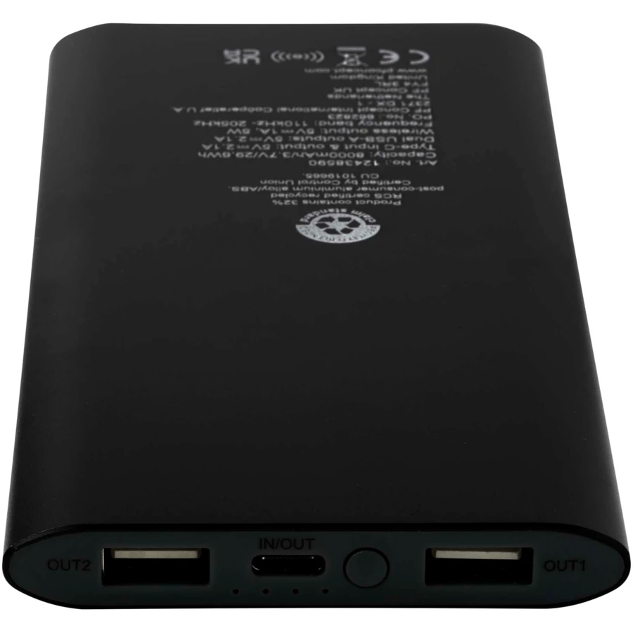 Power bank z portem wejścia/wyjścia typu C i 2x portami USB-A, co oznacza, że można ładować 3 urządzenia jednocześnie. Nadaje się także do bezprzewodowego ładowania o mocy 5 W dla wszystkich urządzeń obsługujących Qi. Powerbank wyposażony jest w akumulator litowo-polimerowy o pojemności 8000 mAh, który zapewnia całkowitą moc wyjściową wynoszącą maks. 10 W. Ten powerbank jest wykonany w 28% z tworzyw sztucznych pochodzących z recyklingu z certyfikatem RCS. Dostarczany z kablem ładującym TPE typu C na USB-A.
