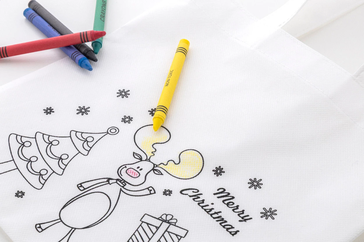 Kolorowanka - torba świąteczna z włókniny RPET z 5 kredkami.