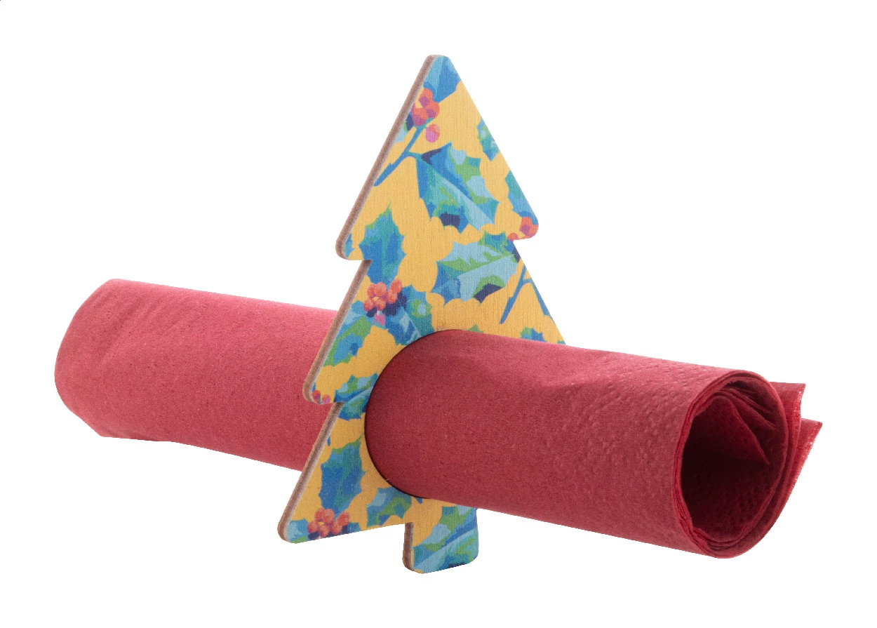 Wykonany na zamówienie, full kolorowy, zadrukowany pierścień na serwetki w kształcie choinki, wykonany ze sklejki brzozowej. Cena zawiera jednostronny nadruk UV LED. Min. ilość: 100 szt.