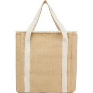 Duża torba termoizolacyjna Juta wykonana z wytrzymałej i odpornej na zużycie laminowanej juty. Posiada dużą (19 litrową) komorę główną, która może pomieścić sześć 1,5-litrowych butelek, wyłożoną wyjątkowo grubą i bezpieczną dla żywności izolacją aluminiową, która utrzymuje napoje, artykuły spożywcze i przekąski w niskiej temperaturze, suche i chronione przez wiele godzin. Torba ma górne zapięcie na suwak, przednią kieszeń i 2 bawełniane tkane uchwyty (50 x 2,5 cm). Wyprodukowano w Indiach z certyfikatem OEKO-TEX®.