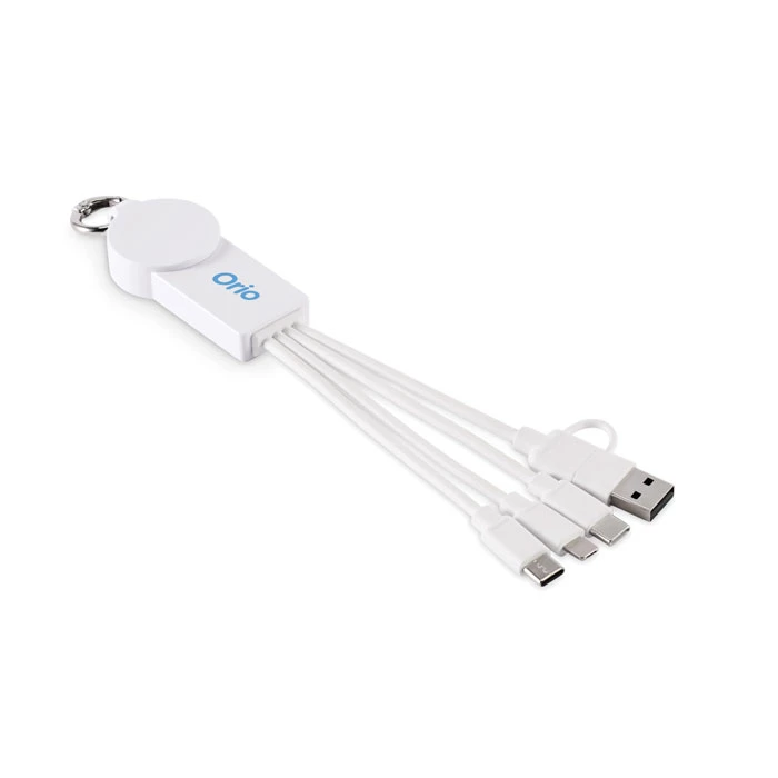 Brelok do kluczy z kablem do ładowania z wejściem: 2 w 1 typu C i typu A. Wyjście: Ładowanie zegarka (Samsung® i Apple®), 2 x typ-C i micro-B (2 w 1 pin). Kabel wykonany z TPE pochodzącego z recyklingu.