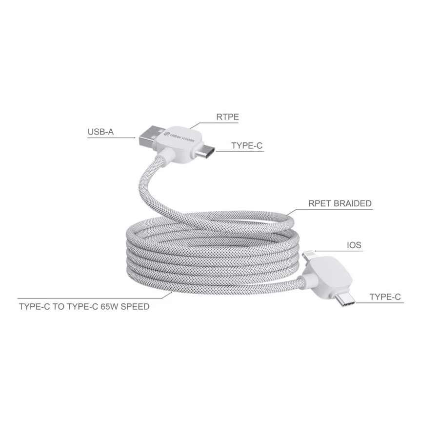 Kabel do ładowania i synchronizacji, 4 końcówki: 2 x USB typu C, USB i kompatybilna z iOS, dzięki magnetycznej konstrukcji kabel nie plącze się, szybkość ładowania za pomocą końcówek USB C do USB C do 65W, nadaje się do ładowania laptopa, wykonany z ABS z recyklingu, całkowita zawartość materiałów z recyklingu obliczona na podstawie wagi całkowitej produktu: 55%