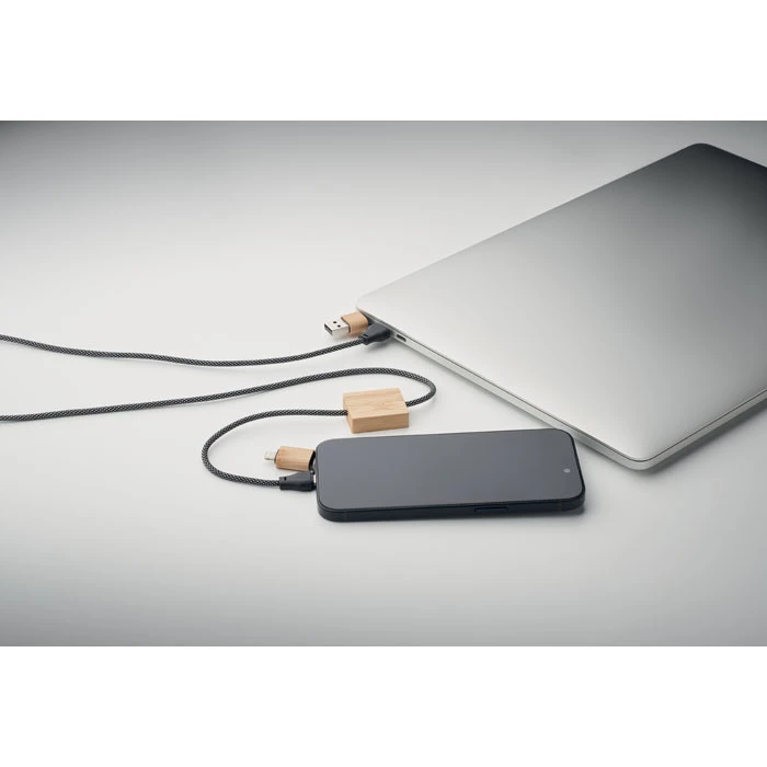 Kabel do ładowania 60W z RPET z bambusowymi detalami. Wejście: 2-w-1 Type-C i Type-A. Wyjście: Typ-C i 2 w 1.