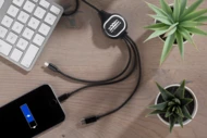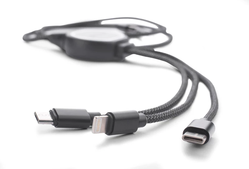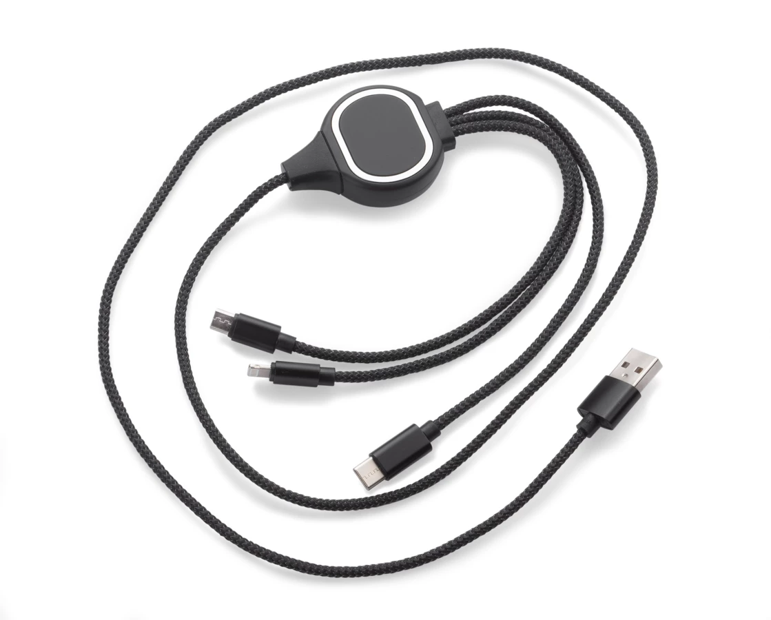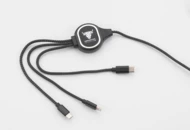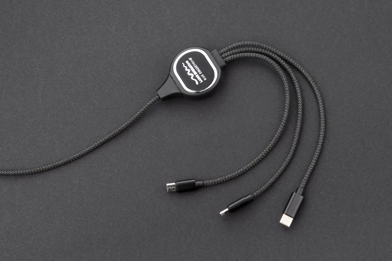 Kabel LUX to świetny gadżet reklamowy, gdyż posiada on idealne miejsce na wygrawerowane logo, które podświetli się po podłączeniu kabla! Jest to kabel 3 w 1, co oznacza, że posiada końcówki: micro USB, USB typu C i Lightining (iPhone). Sam przewód powleczony jest wzmacnianym materiałem i ma długość ok. 1 m. Kabel służy wyłącznie do ładowania.