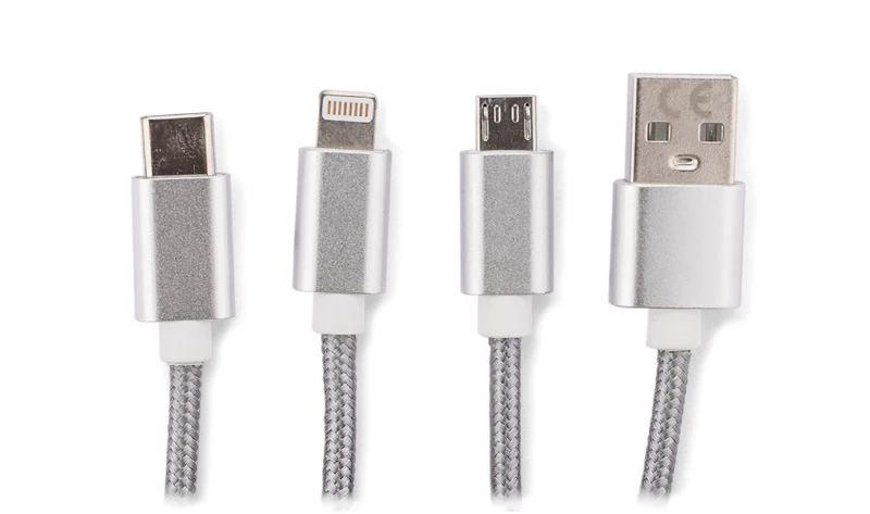 Kabel USB 3 w 1 TAUS do ładowania różnych urządzeń posiada trzy końcówki: micro USB, Lightning (iPhone) i USB typu C. Kabel jest powleczony tkaniną, a końcówki USB są wykonane z metalu. Praktyczny gadżet dla każdego użytkownika mobilnych urządzeń.