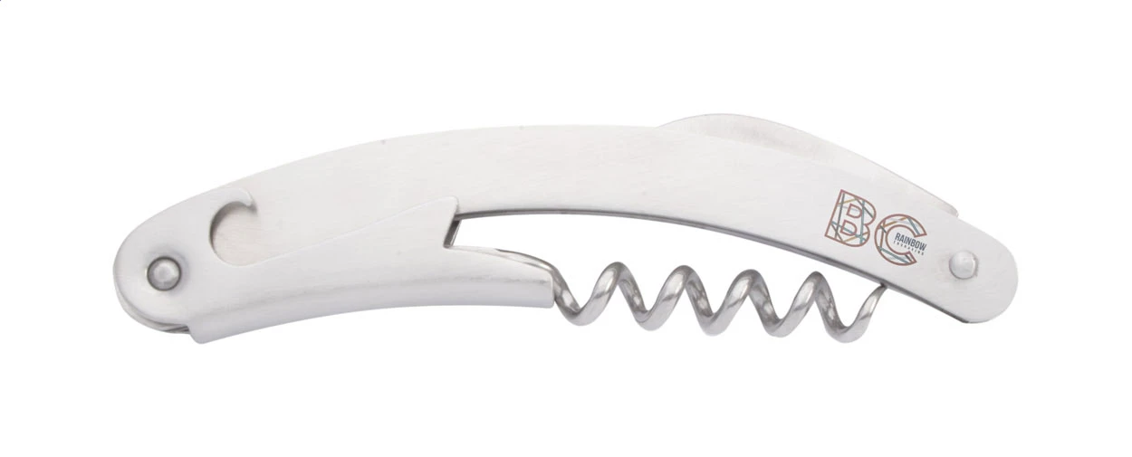 Metalowy korkociąg z otwieraczem do butelek, z małym nożem.