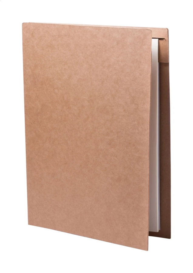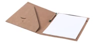 Teczka na dokumenty z papieru z recyklingu z notatnikiem z 20 gładkimi kartkami i długopisem z niebieskim wkładem.
