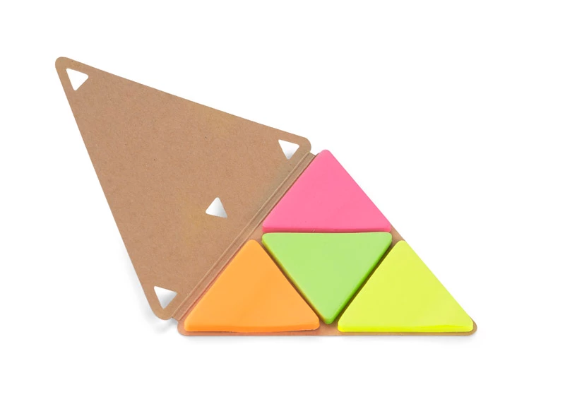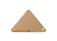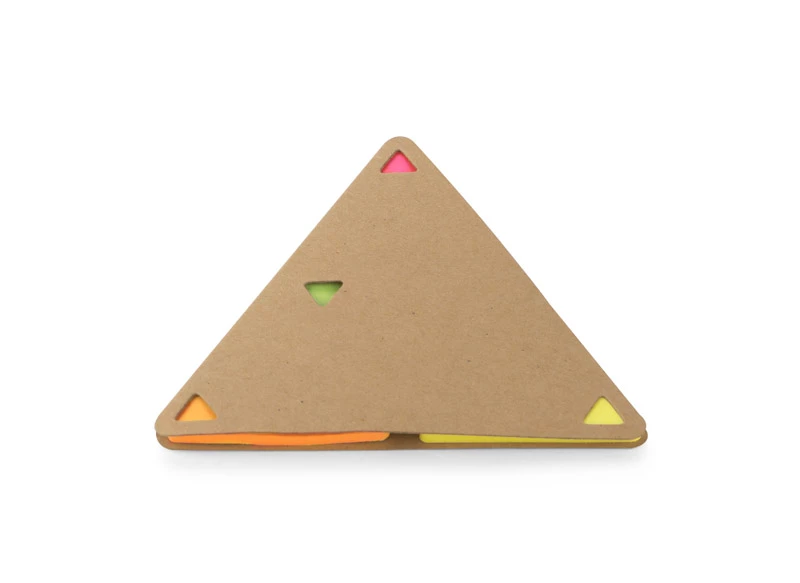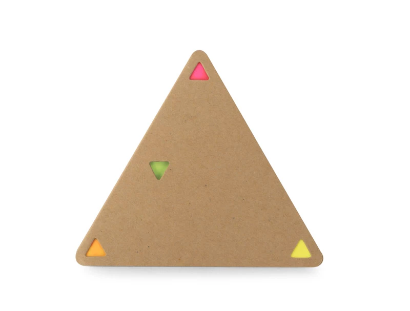 Karteczki samoprzylepne PEL w kształcie trójkąta z ekologiczną papierową okładką. Wewnątrz znajduje się 25 sztuk karteczek w 4 kolorach: pomarańczowym, różowym, zielonym, żółtym.