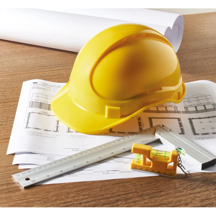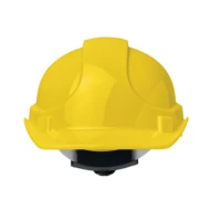 Kask z ABS dla pracowników budowlanych i magazynów. Wyposażony w otwory wentylacyjne, odpinany pasek podbródkowy i opaskę przeciwpotną. Regulowana opaska na głowę (51-63 cm). EN397