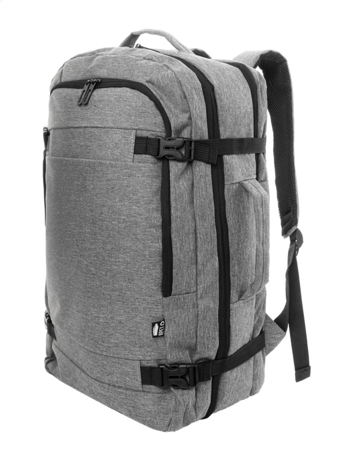 Dwufunkcyjny plecak RPET i zarazem torba na dokumenty z 2 przegrodami na suwak, kieszenią przednią na suwak i wyściełaną przegrodą na laptopa (15"). Z kieszenią antykradzieżową, paskiem na wózek, wyściełanym tyłem i paskami na ramiona. Poliester RPET 600D, z charakterystyczną metką RPET.