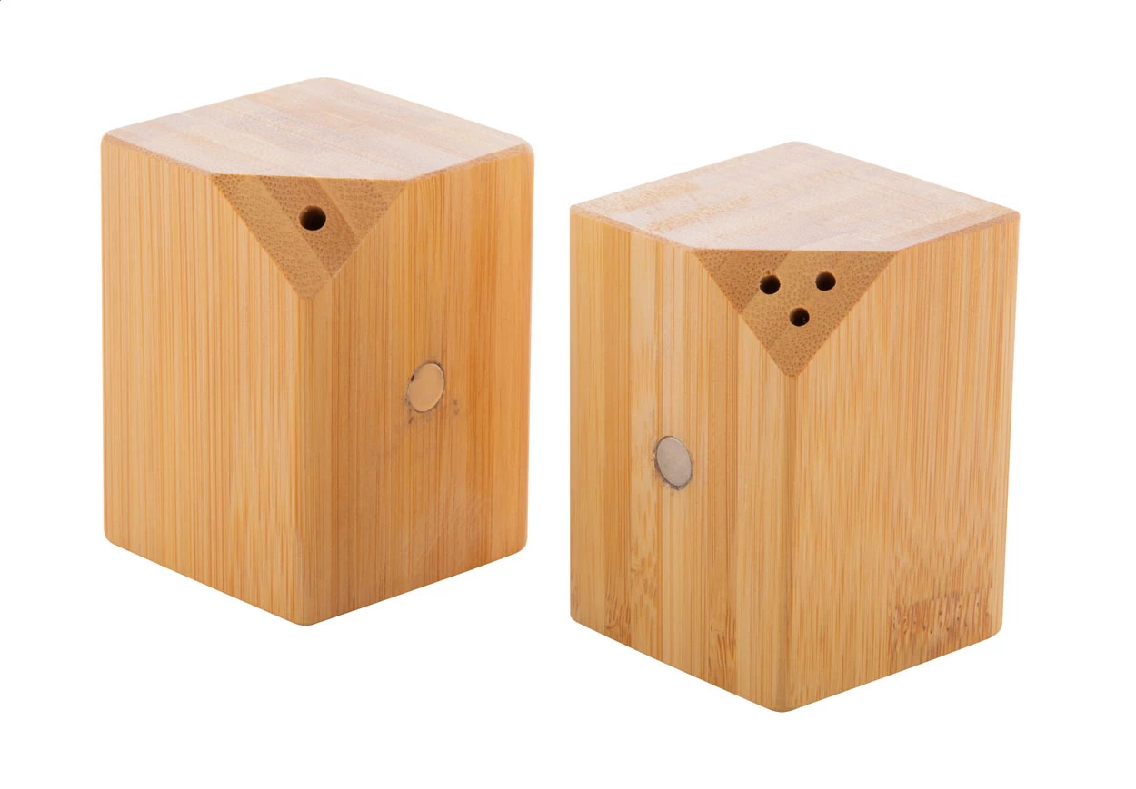 Bambusowy zestaw składający się z solniczki i pieprzniczki. Zestaw zawiera wbudowane magnesy w celu łatwiejszego przechowywania.