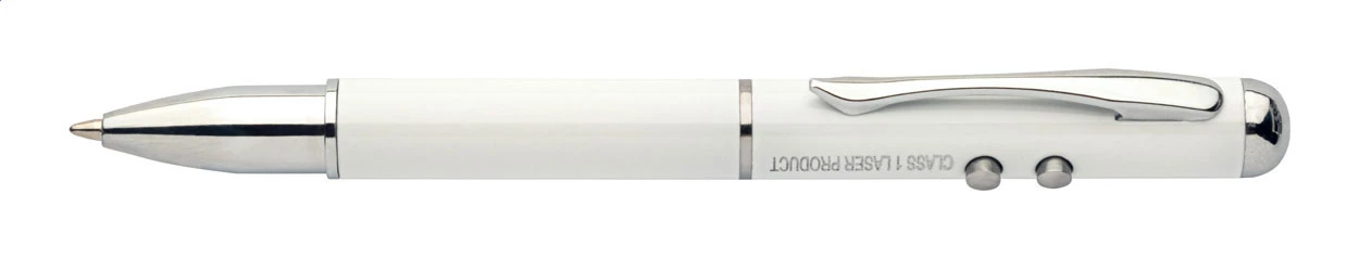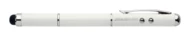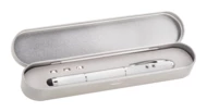 Wielofunkcyjny wskaźnik laserowy z długopisem, koncówką do ekranów dotykowych i latarką LED. W zestawie z metalowym pudełkiem i bateriami.