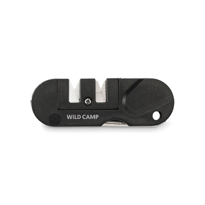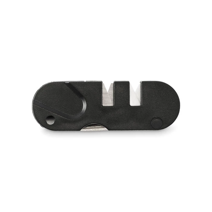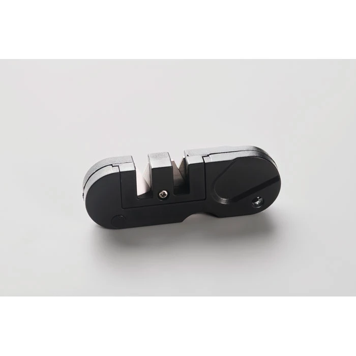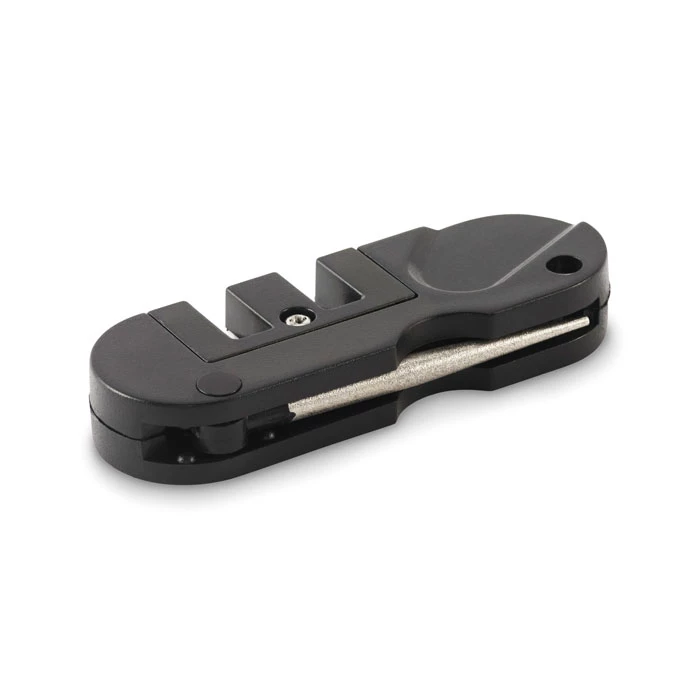 Kieszonkowa ostrzałka do noży z ABS. Wyposażona w: 1x ceramiczne ostrze do wykańczania i polerowania, 1x ostrze z węglika wolframu do szybkiego ostrzenia oraz naprawy mocno uszkodzonych ostrzy, 1x stożkowy pręt diamentowy do ostrzenia noży ząbkowanych, usuwania wyszczerbień oraz ogólnego ostrzenia.