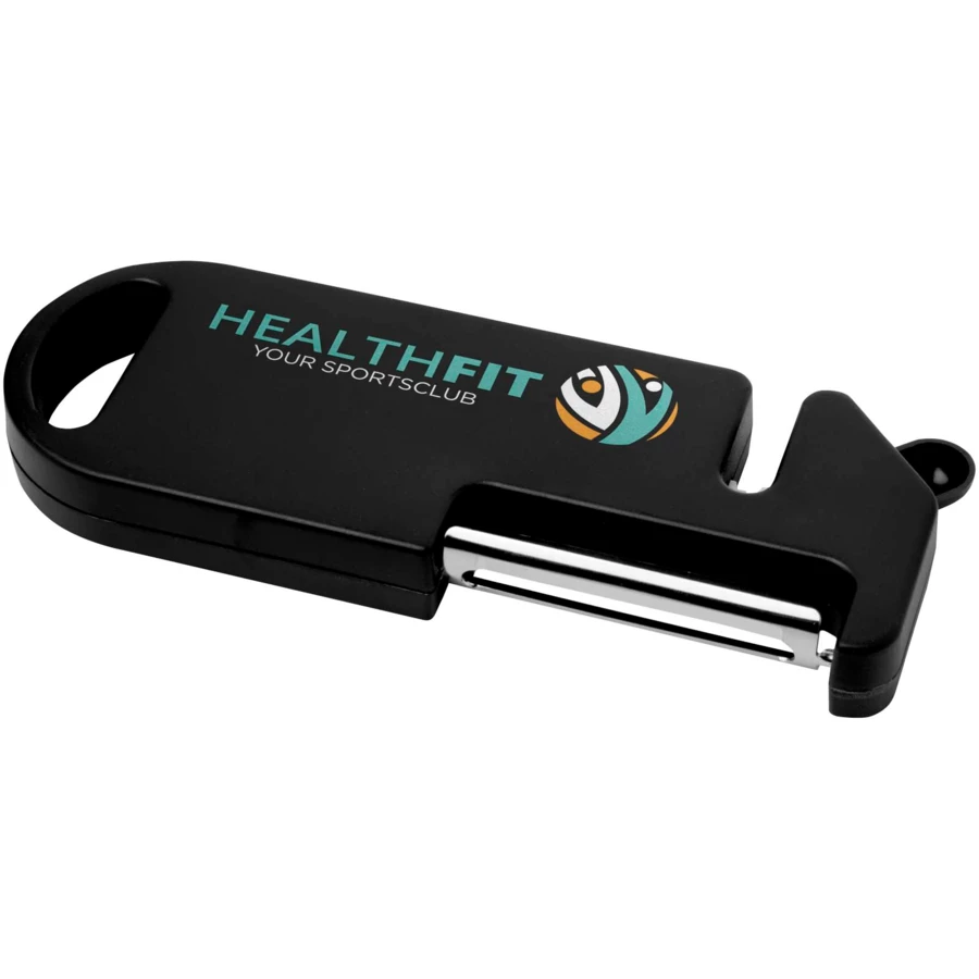 To wielofunkcyjne narzędzie kuchenne łączy w sobie cztery podstawowe funkcje w jednej kompaktowej konstrukcji. Wykonane z tworzyw sztucznych pochodzących z recyklingu, zawiera obieraczkę, otwieracz do butelek, ostrzałkę do noży i spiczastą końcówkę do usuwania oczek z ziemniaków. Wbudowany otwór do zawieszania umożliwia łatwe przechowywanie. Praktyczne i oszczędzające miejsce, jest uniwersalnym, niezbędnym gadżetem każdego domowego kucharza.