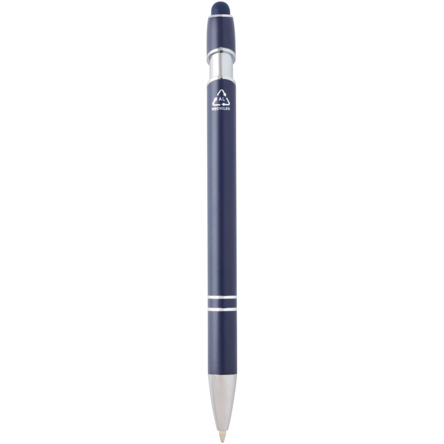 Długopis Kish ze srebrnym wykończeniem ma korpus wykonany z aluminium z recyklingu i rysik dotykowy wykonany z silikonu. Aluminium z recyklingu ogranicza ilość odpadów na wysypiskach śmieci i pomaga chronić zasoby naturalne w celu zmniejszenia emisji gazów cieplarnianych. Kolor tuszu: Czarny. Żywotność: 800 metrów. Rozmiar stalówki: 1,0 mm.