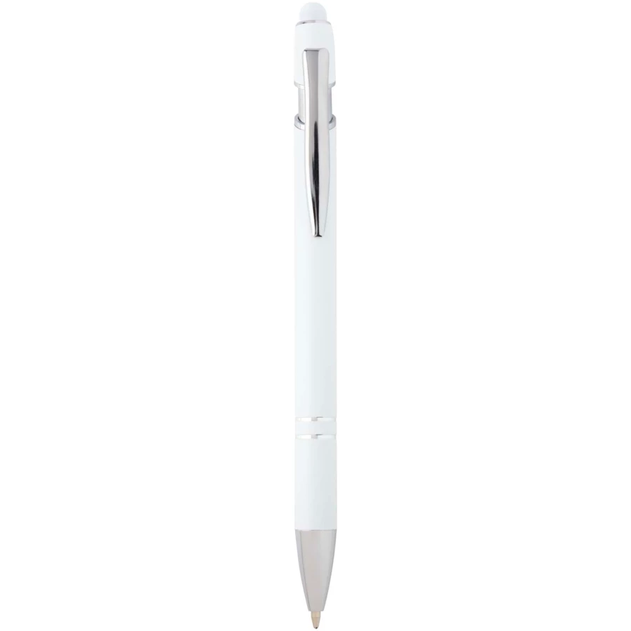 Długopis Kish ze srebrnym wykończeniem ma korpus wykonany z aluminium z recyklingu i rysik dotykowy wykonany z silikonu. Aluminium z recyklingu ogranicza ilość odpadów na wysypiskach śmieci i pomaga chronić zasoby naturalne w celu zmniejszenia emisji gazów cieplarnianych. Kolor tuszu: Niebieski. Żywotność: 800 metrów. Rozmiar stalówki: 1,0 mm.