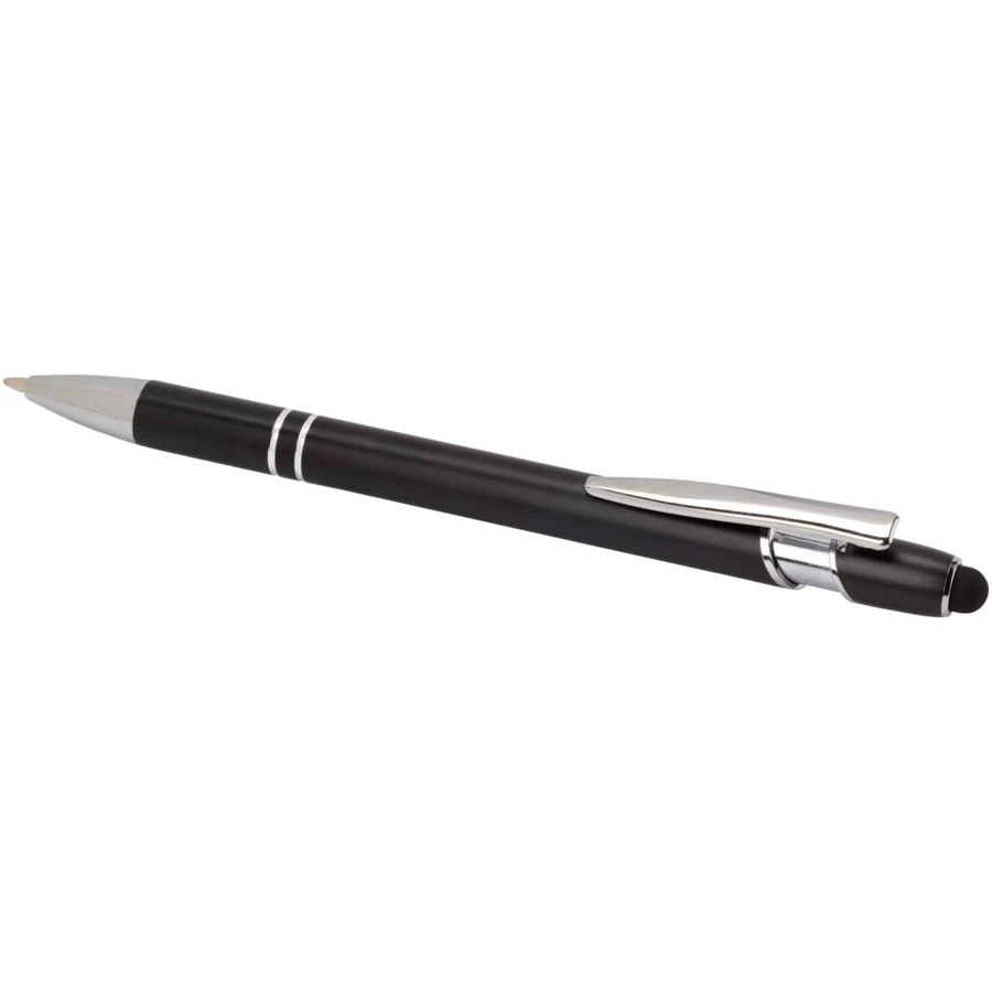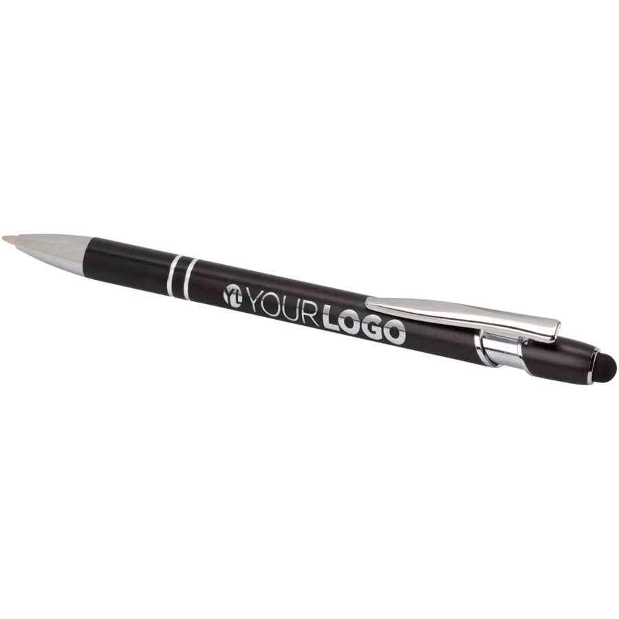 Długopis Kish ze srebrnym wykończeniem ma korpus wykonany z aluminium z recyklingu i rysik dotykowy wykonany z silikonu. Aluminium z recyklingu ogranicza ilość odpadów na wysypiskach śmieci i pomaga chronić zasoby naturalne w celu zmniejszenia emisji gazów cieplarnianych. Kolor tuszu: Niebieski. Żywotność: 800 metrów. Rozmiar stalówki: 1,0 mm.