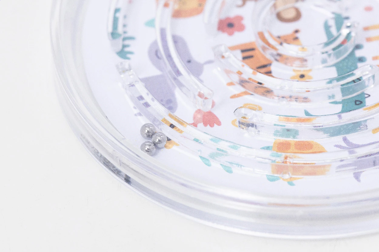 Okrągła gra labiryntowa z recyklingowanego PS z trzema metalowymi kulkami. Z personalizowaną, full kolorową wkładką papierową. Cena zawiera nadruk cyfrowy po obu stronach. Min. ilość: 100 szt.