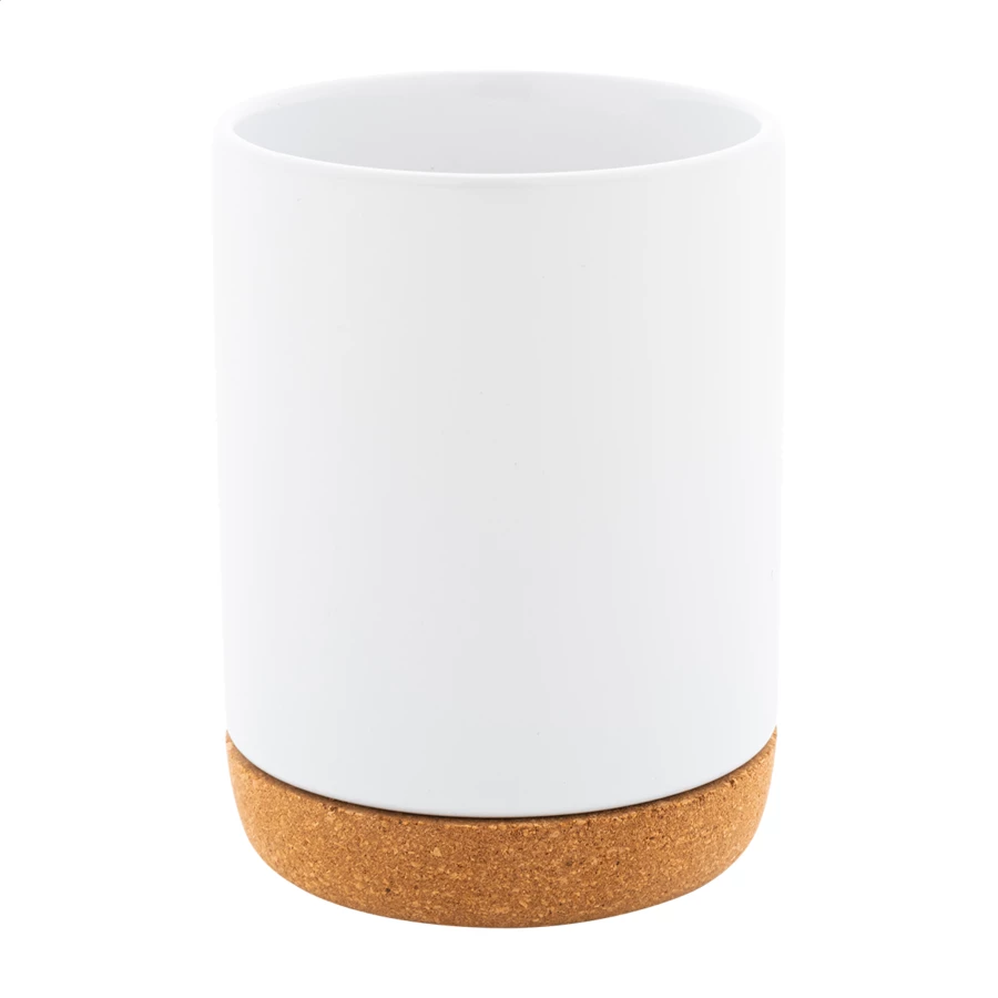 Kubek ceramiczny wysokiej jakości z podstawą z naturalnego korka. Z matowym wykończeniem na zewnątrz i błyszczącym wewnątrz. 280 ml. W pudełku z papieru kraft.