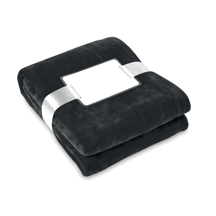 Koc 280g/m² z miłego, miękkiego polaru, przewiązany wstążką, posiada bilecik do nadruku.