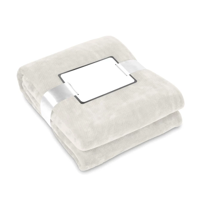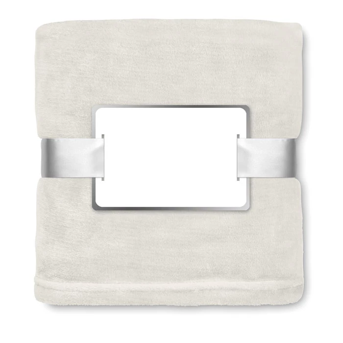 Koc 280g/m² z miłego, miękkiego polaru, przewiązany wstążką, posiada bilecik do nadruku.