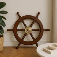 Stylowe koło sterowe z drewna z mosiężnym środkiem to klasyczna dekoracja w klimacie morskim. Wprowadza do wnętrz żeglarski charakter i doskonale komponuje się z odcieniami bieli, błękitu, zieleni i naturalnego drewna.