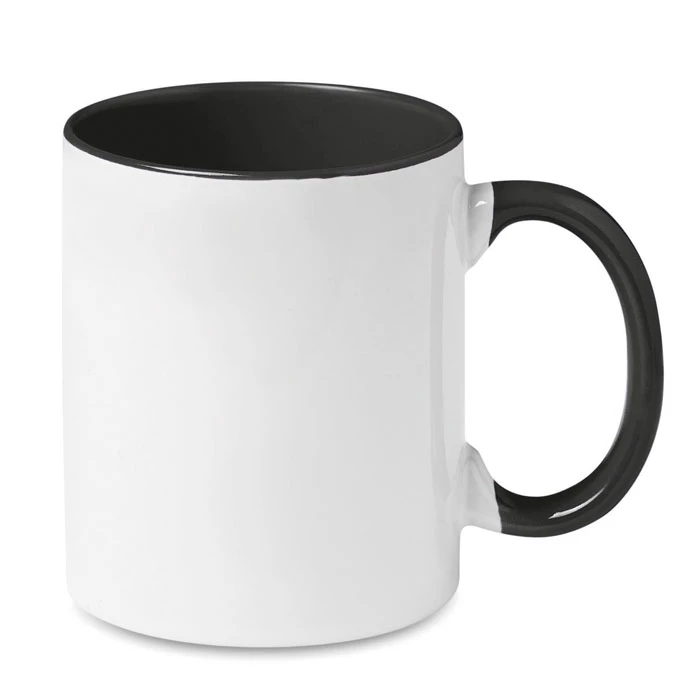 Kubek ceramiczny o pojemności 300 ml pokryty specjalną warstwą pod sublimację, z kolorowym uchwytem i wnętrzem.