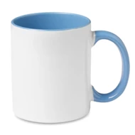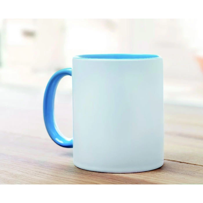 Kubek ceramiczny o pojemności 300 ml pokryty specjalną warstwą pod sublimację, z kolorowym uchwytem i wnętrzem.