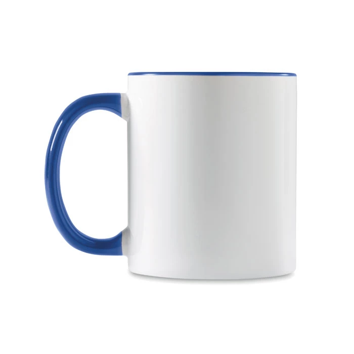 Kubek ceramiczny o pojemności 300 ml pokryty specjalną warstwą pod sublimację, z kolorowym uchwytem i wnętrzem.