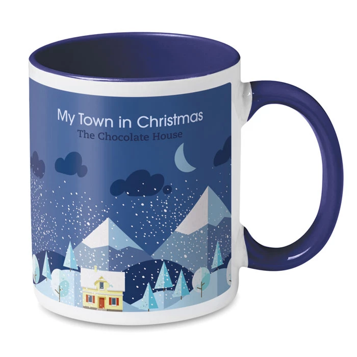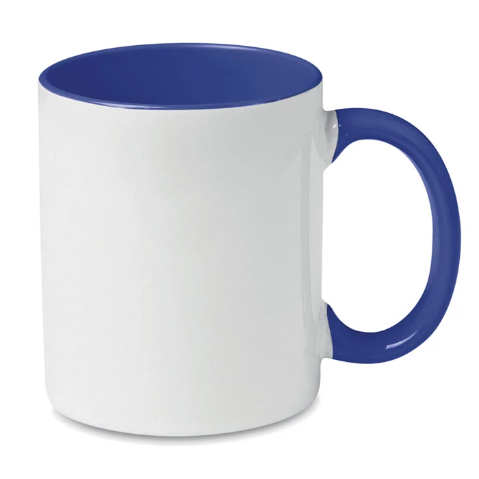 Kubek ceramiczny o pojemności 300 ml pokryty specjalną warstwą pod sublimację, z kolorowym uchwytem i wnętrzem.