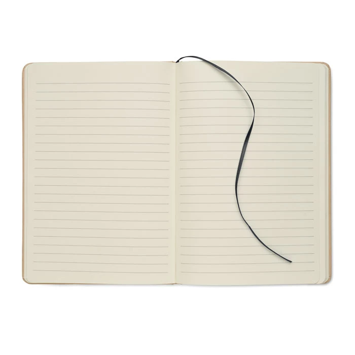 Notatnik A5 z twardą okładką z kartonu pochodzącego z recyklingu. Beżowa okładka z kartonowym pokryciem. 160 stron w linie (80 kartek). Gumka zamykająca, wstążkowa zakładka dopasowana do uwidocznionego koloru. Po grawerowaniu laserowym kolor jest widoczny. FSC®-certified | FSC MIX CREDIT, P7.1, FSC-C213206