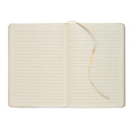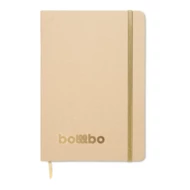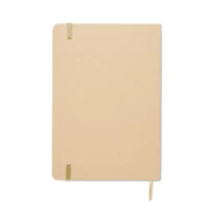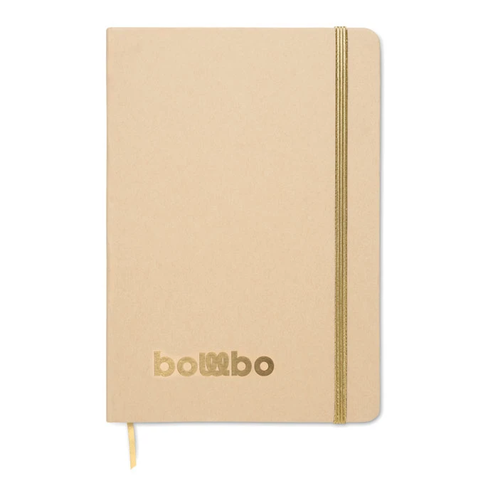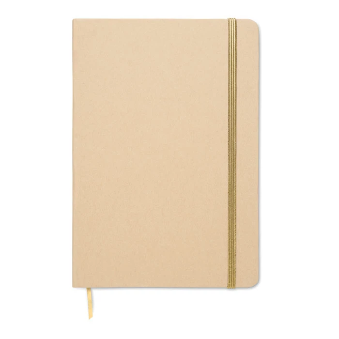 Notatnik A5 z twardą okładką z kartonu pochodzącego z recyklingu. Beżowa okładka z kartonowym pokryciem. 160 stron w linie (80 kartek). Gumka zamykająca, wstążkowa zakładka dopasowana do uwidocznionego koloru. Po grawerowaniu laserowym kolor jest widoczny. FSC®-certified | FSC MIX CREDIT, P7.1, FSC-C213206