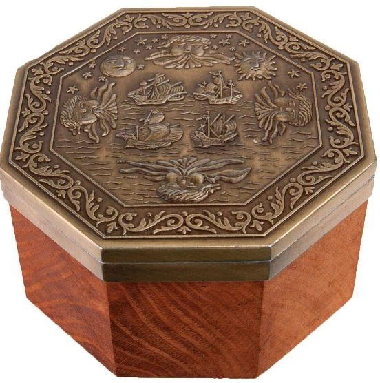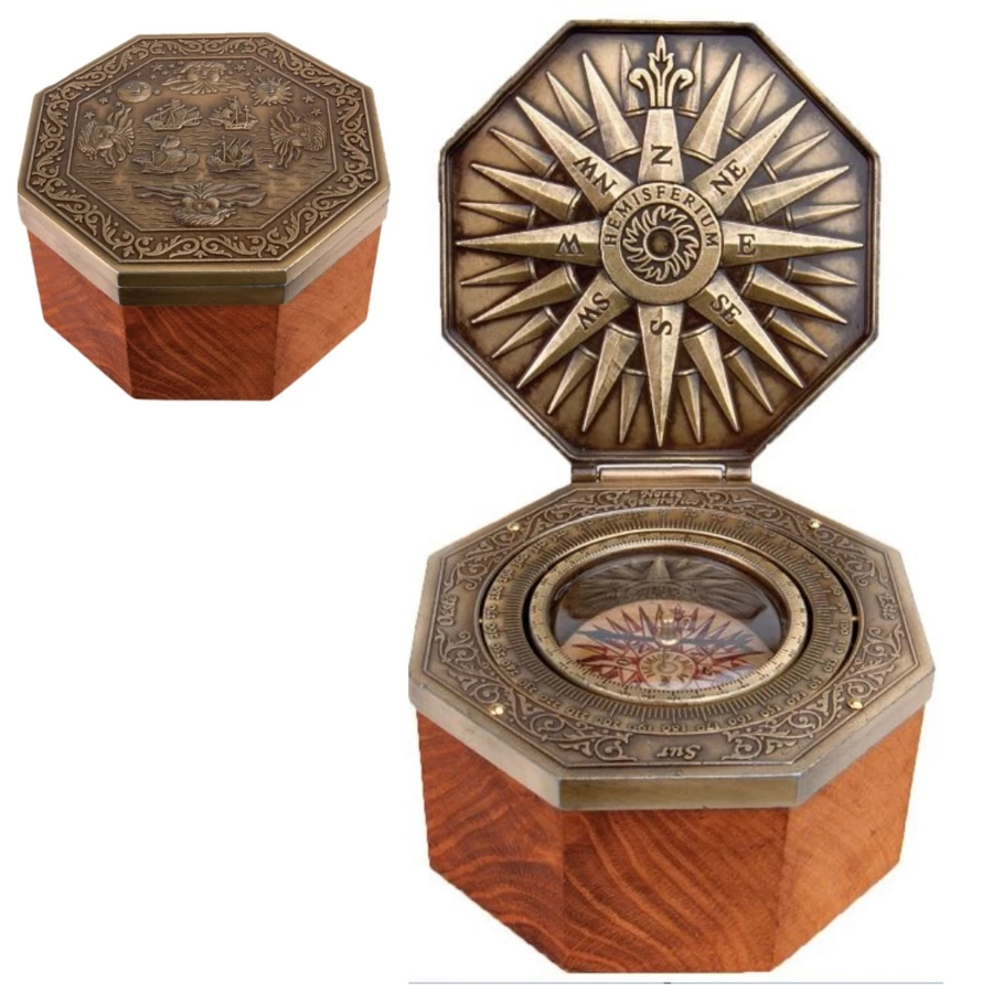 • Materiały Premium: Kompas umieszczony jest w solidnej, ośmiokątnej, drewnianej obudowie, z elementami wykonanymi z mosiądzu.