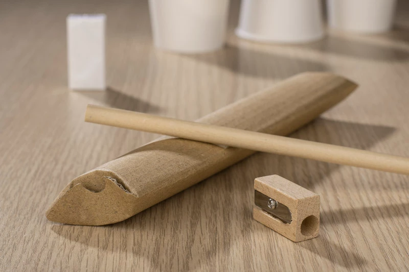 Ekologiczny zestaw składający się z drewnianego ołówka, temperówki i gumki. Całość zapakowana w kartonowe pudełko. Logo zrobimy metodą tampodruku lub graweru.