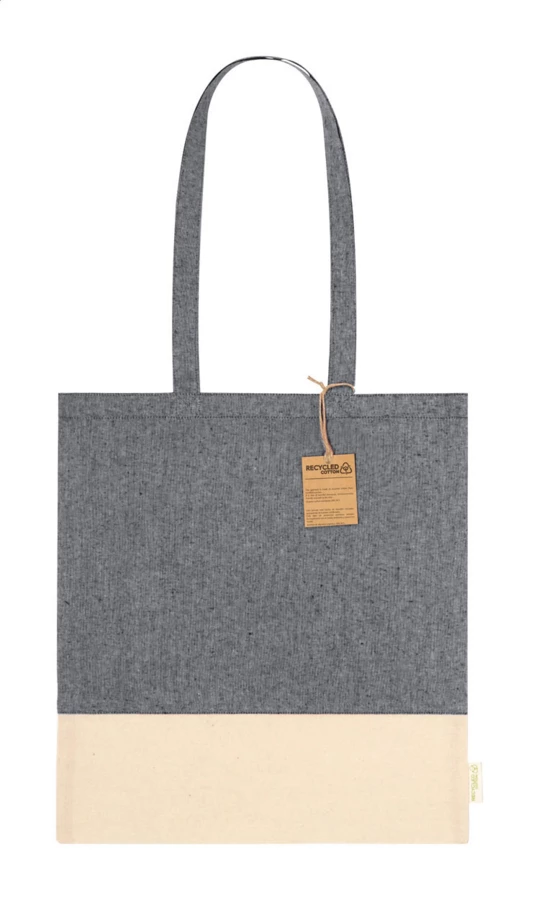 Dwukolorowa torba na zakupy z bawełny pochodzącej z recyklingu, z długimi uchwytami i charakterystyczną metką informującą o bawełnie pochodzącej z recyklingu. 100% bawełna z recyklingu, 120 g/m².