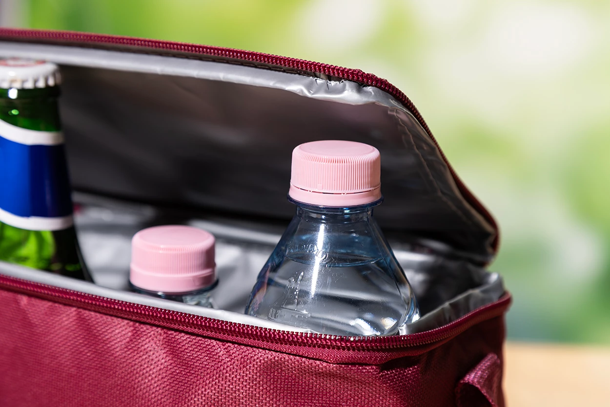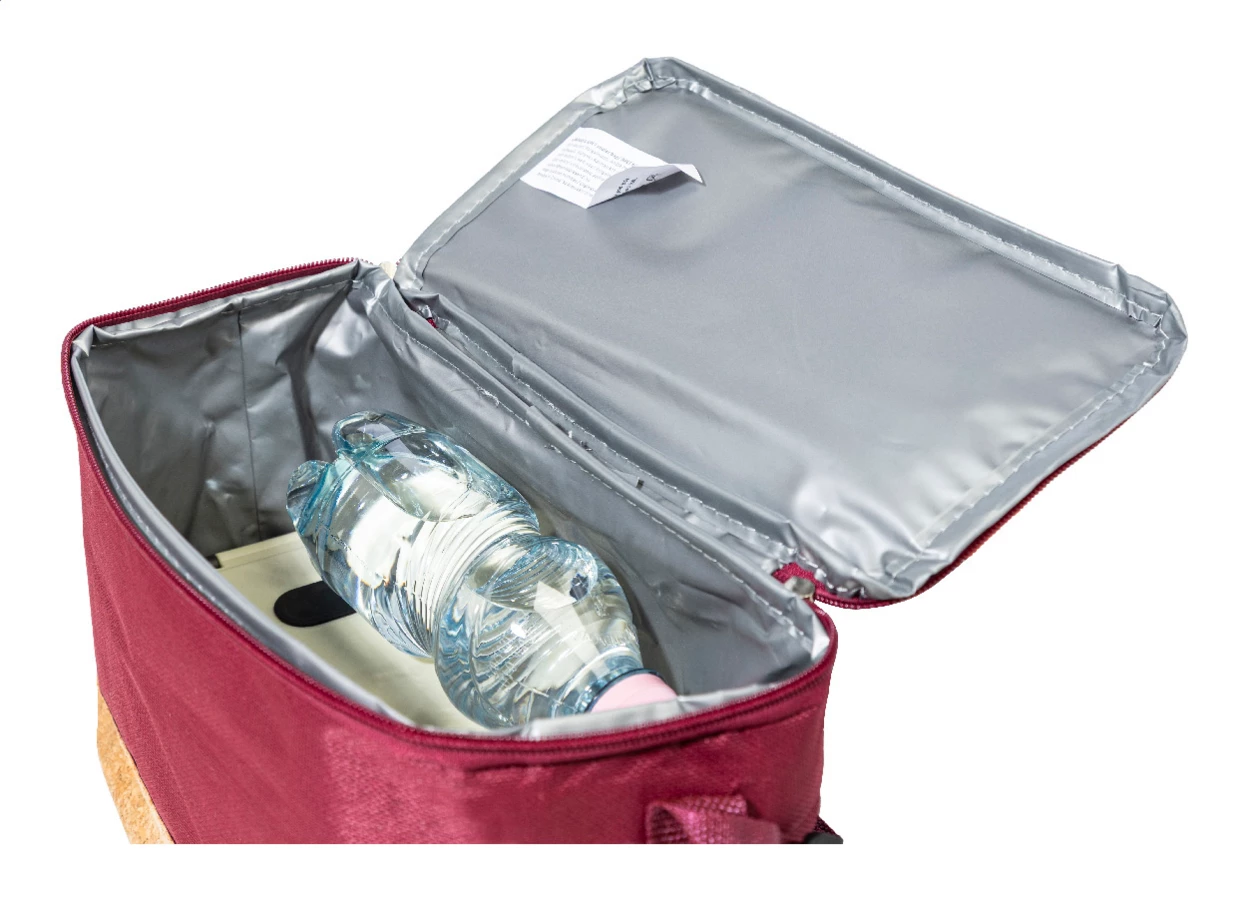 Torba termiczna z poliestru 600D RPET, zapinana na zamek, z podstawą z naturalnego korka, wyściółką PEVA i regulowanym paskiem na ramię. Z charakterystyczną metką RPET.