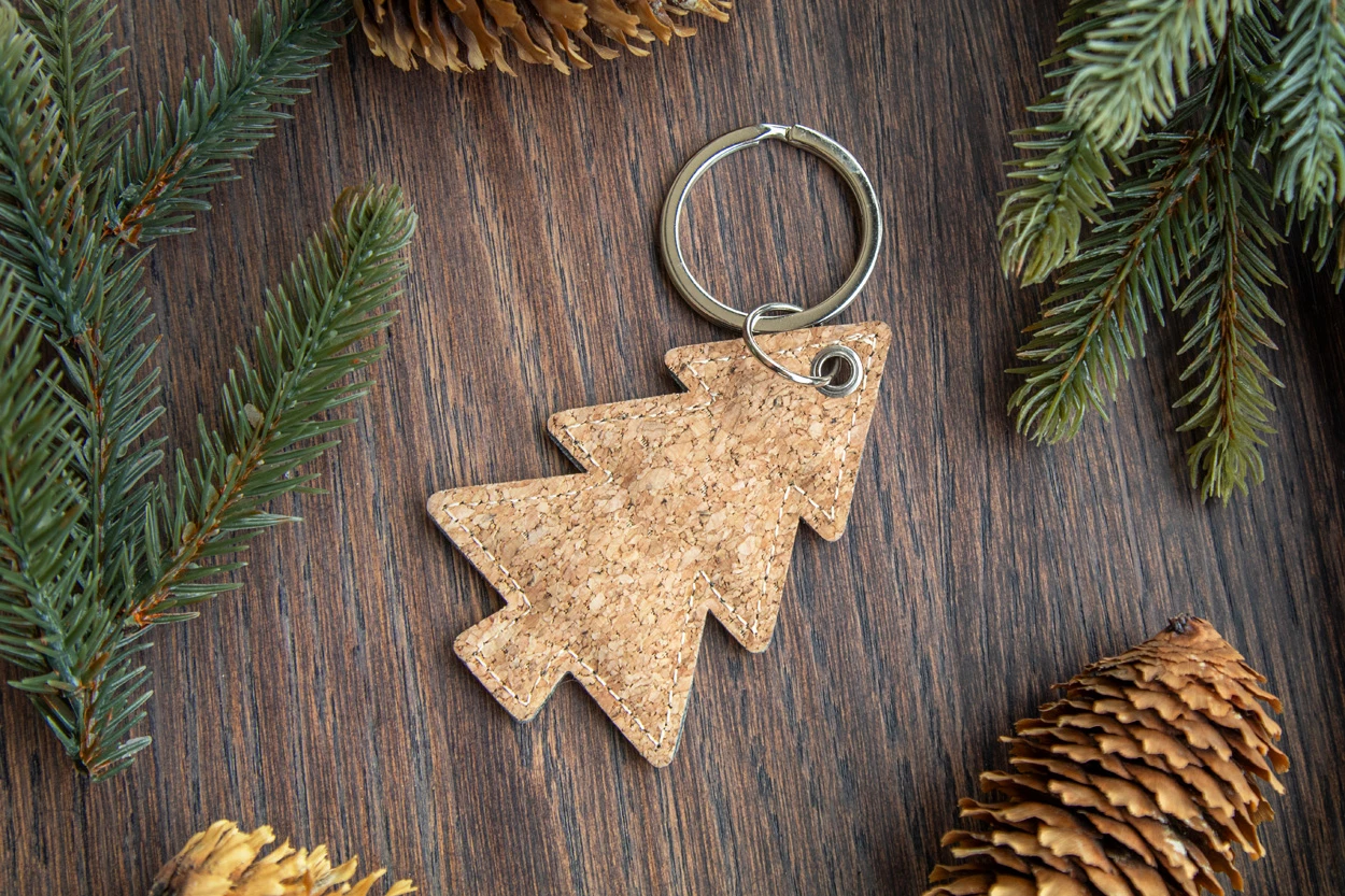 Brelok w kształcie choinki z naturalnego korka i skóry PU z metalowym kółkiem.