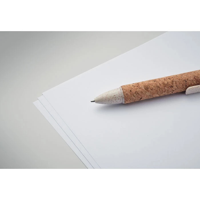Długopis z 4 kolorowymi wkładami, korkowym korpusem i końcówkami ze słomy pszenicznej (50%) i plastiku ABS (50%).