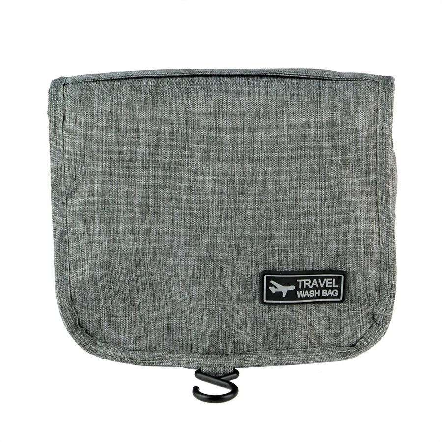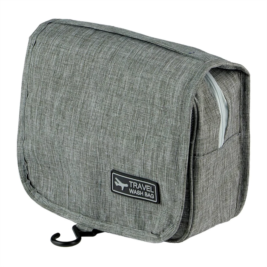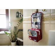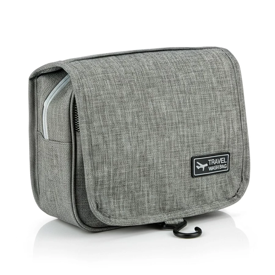 Kosmetyczka z wieloma przegrodami, przegroda główna na zamek błyskawiczny, 1 kieszeń siateczkowa, przezroczysta kieszeń oraz kieszeń przednia na zamek błyskawiczny, haczyk do powieszenia w komplecie