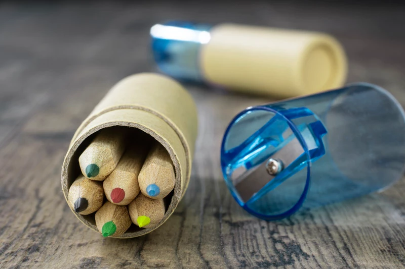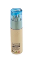 Drewniane kredki w sześciu kolorach. Całość zapakowana w tekturową tubę, która zamykana jest plastikowym zamknięciem zawierającym temperówkę. Logo nadrukujemy na tubie.