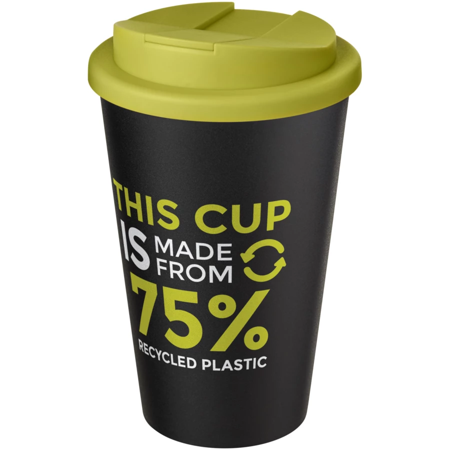 Dwuwarstwowy, izolowany kubek ze szczelną zakręcaną pokrywą odporną na zalanie. Pokrywa zamykana jest na zatrzask, aby lepiej zapobiegać rozlaniom i wykonana została bez użycia silikonu, dzięki czemu kubek w pełni nadaje się do recyklingu. Kubek wykonany jest w 100% z polipropylenu, a pokrywka z polipropylenu klasy spożywczej. Zgodny z EN12875-1; nadaje się do mycia w zmywarce oraz podgrzewania w kuchence mikrofalowej. Pojemność 350 ml. Dostarczany w torbie, którą można kompostować w domu. Wyprodukowano w Wielkiej Brytanii. Produkt wolny od BPA.