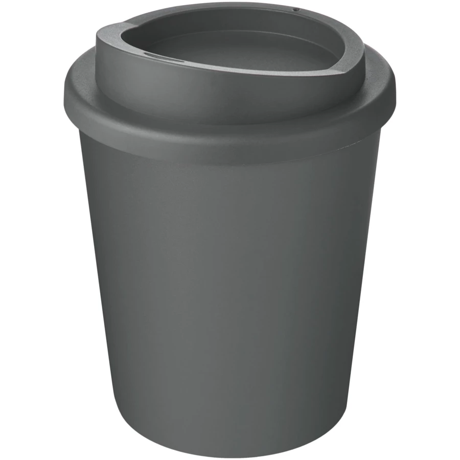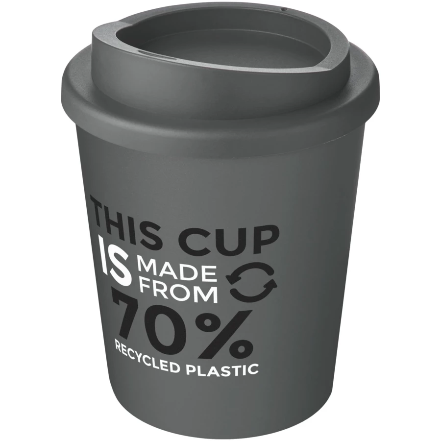 Kompaktowy, izolowany kubek o podwójnych ściankach z zakręcaną pokrywką. Mieści się w większości ekspresów do kawy. Kubek wykonany jest w 100% z polipropylenu z recyklingu, a pokrywka z polipropylenu klasy spożywczej. Ponieważ pokrywka nie jest wykonana z materiałów pochodzących z recyklingu, można ją zamówić w szerokiej gamie różnych kolorów. Kubek w pełni nadaje się do recyklingu. Odcienie czerni lub bieli mogą się różnić. W przypadku opcji białej występuje efekt tekstury kolorystycznej, co wynika z natury materiału pochodzącego z recyklingu. Pojemność 250 ml. Wyprodukowano w Wielkiej Brytanii. Zapakowany w torbę, którą można kompostować w domu. Produkt wolny od BPA. Można myć w zmywarce.