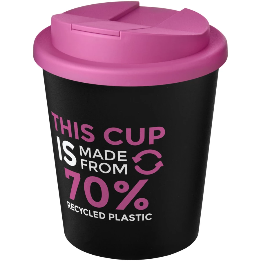 Dwuwarstwowy, izolowany kubek ze szczelną zakręcaną pokrywą odporną na zalanie. Pokrywa zamykana jest na zatrzask, aby lepiej zapobiegać rozlaniom i wykonana została bez użycia silikonu, dzięki czemu kubek w pełni nadaje się do recyklingu. Kubek wykonany jest w 100% z polipropylenu z recyklingu, a pokrywka z polipropylenu klasy spożywczej. Odcienie czerni lub bieli mogą się różnić. W przypadku opcji białej występuje efekt tekstury kolorystycznej, co wynika z natury materiału pochodzącego z recyklingu. Zgodny z EN12875-1; nadaje się do mycia w zmywarce oraz podgrzewania w kuchence mikrofalowej. Pojemność 250 ml. Dostarczany w torbie, którą można kompostować w domu. Wyprodukowano w Wielkiej Brytanii. Produkt wolny od BPA. Można myć w zmywarce.