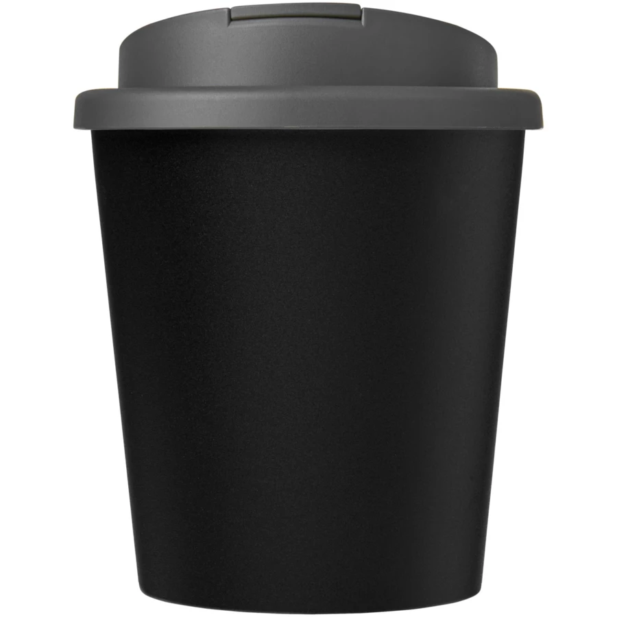 Dwuwarstwowy, izolowany kubek ze szczelną zakręcaną pokrywą odporną na zalanie. Pokrywa zamykana jest na zatrzask, aby lepiej zapobiegać rozlaniom i wykonana została bez użycia silikonu, dzięki czemu kubek w pełni nadaje się do recyklingu. Kubek wykonany jest w 100% z polipropylenu z recyklingu, a pokrywka z polipropylenu klasy spożywczej. Odcienie czerni lub bieli mogą się różnić. W przypadku opcji białej występuje efekt tekstury kolorystycznej, co wynika z natury materiału pochodzącego z recyklingu. Zgodny z EN12875-1; nadaje się do mycia w zmywarce oraz podgrzewania w kuchence mikrofalowej. Pojemność 250 ml. Dostarczany w torbie, którą można kompostować w domu. Wyprodukowano w Wielkiej Brytanii. Produkt wolny od BPA. Można myć w zmywarce.