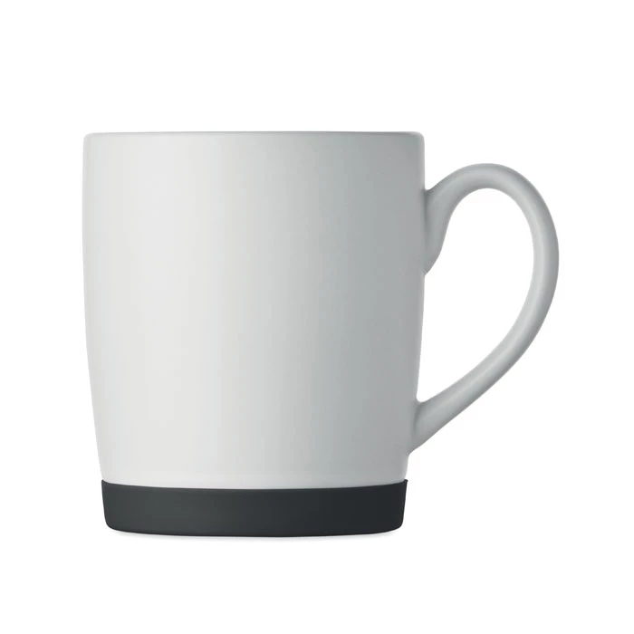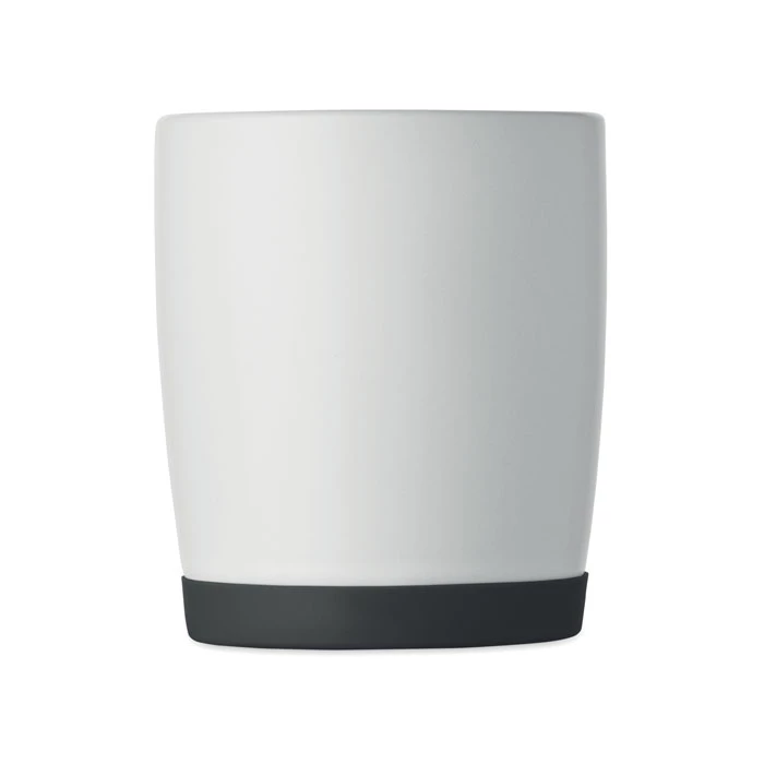 Ceramiczny kubek z białym matowym wykończeniem i silikonową podstawą zapewniającą stabilność. Pojemność 300 ml. Pakowany pojedynczo w białe pudełko kartonowe.