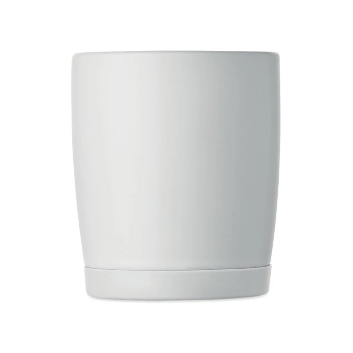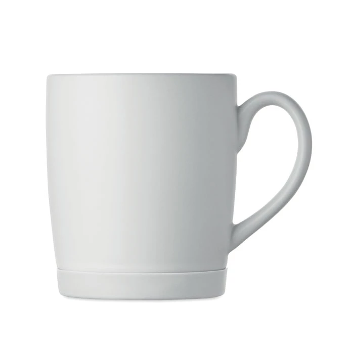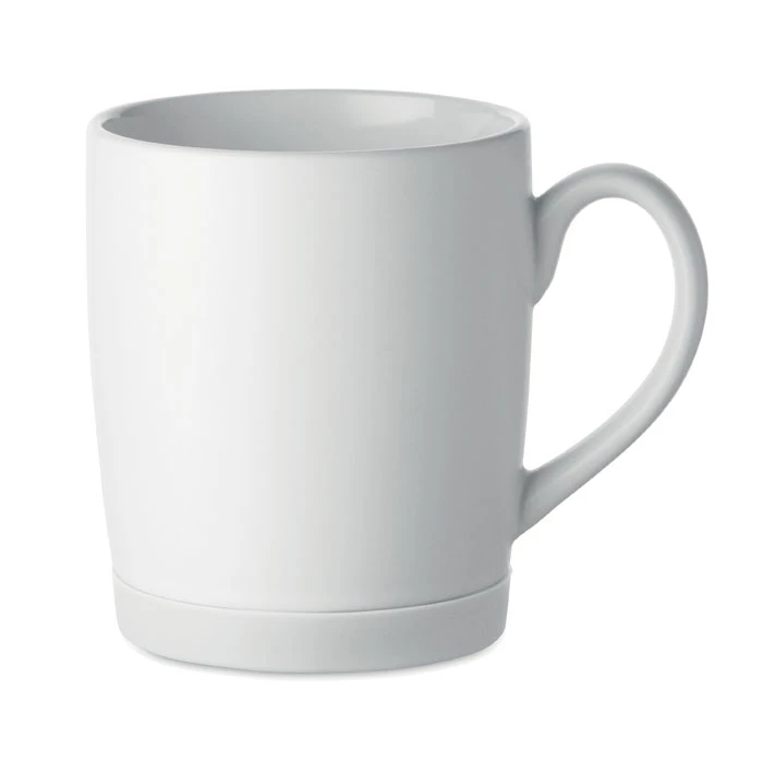 Ceramiczny kubek z białym matowym wykończeniem i silikonową podstawą zapewniającą stabilność. Pojemność 300 ml. Pakowany pojedynczo w białe pudełko kartonowe.