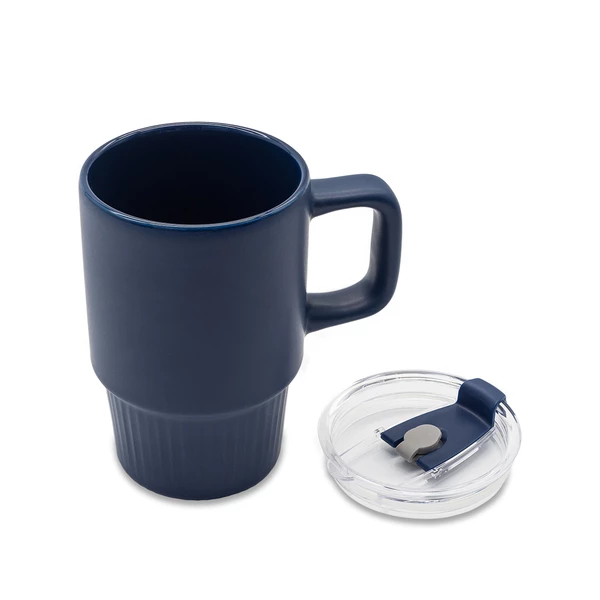 Kubek ceramiczny (440 ml) w matowym wykończeniu. Wyposażony w praktyczną, przezroczystą pokrywkę. Minimalistyczny i nowoczesny, idealny do biura i domu.