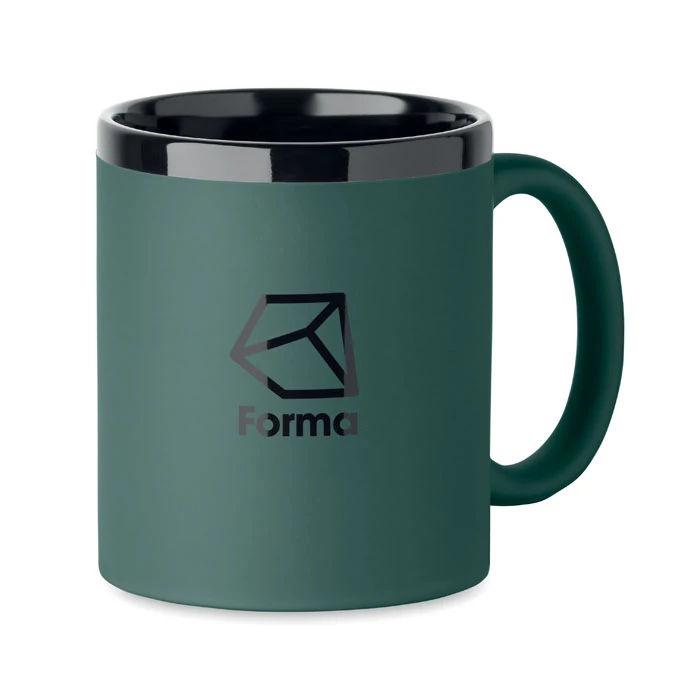 Ceramiczny kubek z powłoką soft touch i czarnym wnętrzem/obrzeżem. Odpowiedni do grawerowania laserowego. Pojemność: 300 ml. Pakowany pojedynczo w białe pudełko kartonowe.