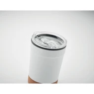 Zewnętrzna podwójna ścianka ze stali nierdzewnej i wewnętrzna strona z PP. Korkowa podstawka i przesuwane otwarcie do picia. Nie przecieka. Pojemność: 300 ml.